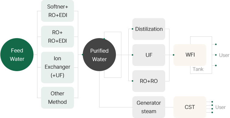 다양한 제조소의 요구 수질 기준을 만족하는 적절한 시스템을 설계하며, 사용자 편의를 위한 시스템을 제안해드립니다. 간단한 시스템으로 작은 면적에도 적용가능하며, GMP에 적격한 자재를 사용함으로써 성적서 제공 및 Validation이 가능한 시스템입니다.